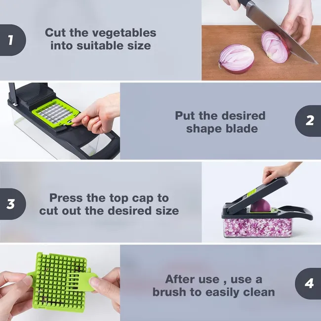 Answer 1: The vegetable chopper features a convenient detachable design that allows for quick assembly and disassembly. All parts are dishwasher-safe, making cleanup a breeze and saving you valuable time after cooking.
